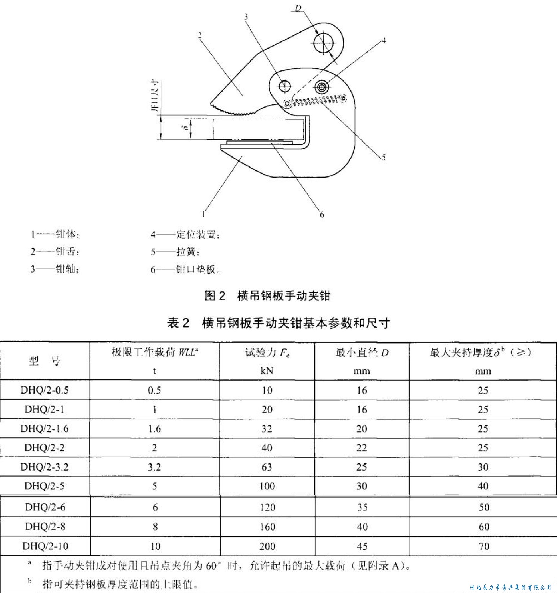 2.3.1 豎吊鋼板手動夾鉗的基本參數(shù)和尺寸 (具體配件名稱,此參數(shù)可和樣本書上做對比